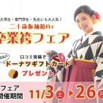 みなさん、こんにちは😊 二十歳振袖館Azつくば本店のまゆです🐈 本日は、11月3日から始まった 💗卒業ハカマフェア💗 についてご紹介します♬ まだ卒業袴を決めていない方、必見ですよ~!!! それでは、START☆ まずは、卒業衣装のプランのご説明をしたいと思います(#^.^#) ①卒業袴レンタルセットプラン ¥15,000~tax こちらは、二尺袖に袴を合わ...