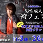 みなさん、こんにちは😊 二十歳振袖館Azつくば本店のとわこです🐸 本日は11月の男性成人袴フェアのご紹介です 8-) 袴フェアの開催期間は11/3から11/26までとなっています! Azでは、 サムライパックを3名以上でお友達と一緒に契約していただきますと グループ撮影料が無料になります!!!! さらに!! お友達とのお写真がキャビネサイズでプレゼントになります! また、ご来店された方、みなさん お菓子のつかみ取りが出来ちゃいます :-P...