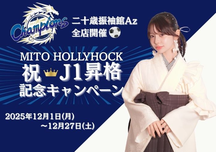 二十歳振袖館Azの運営元株式会社小野写真館は、水戸ホーリーホックのシルバーパートナーとして活動を応援しています。 このたびのJ1昇格を記念して、二十歳振袖館Azでは2025年12月1日(月)より J1昇格|J2優勝 記念セールを開催します。